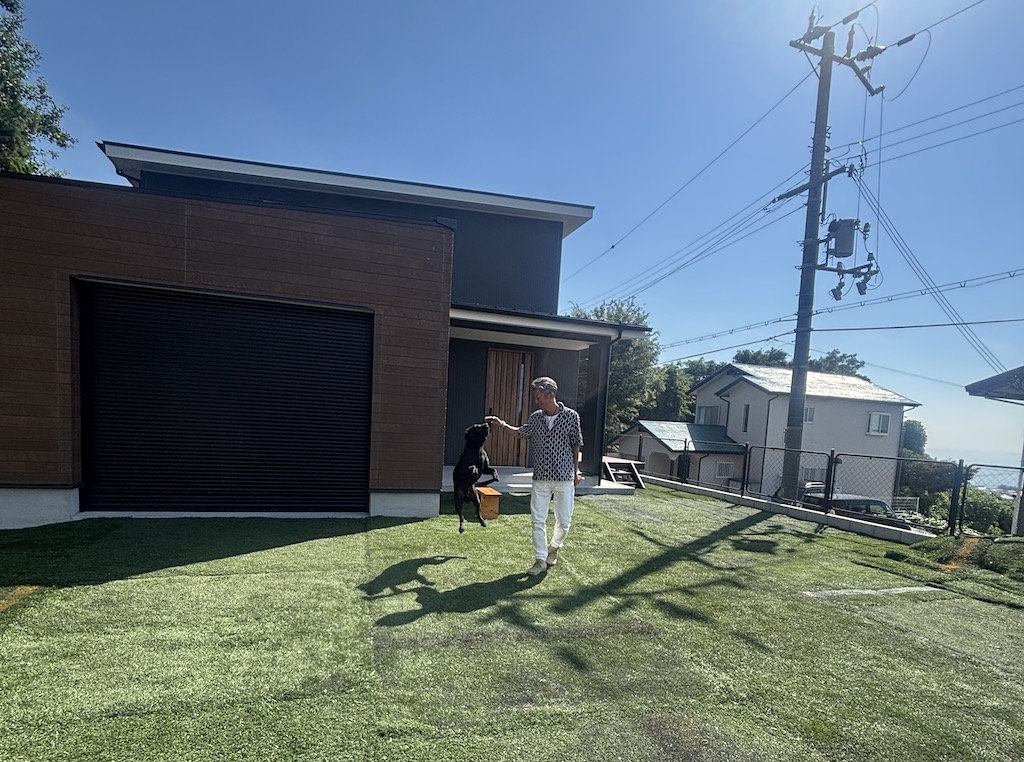 こだわりを散りばめたモダンでミニマルな設計の室内、男の秘密基地な感じがたまらない、誰もが憧れる愛犬と楽しむ高台のガレージハウス。