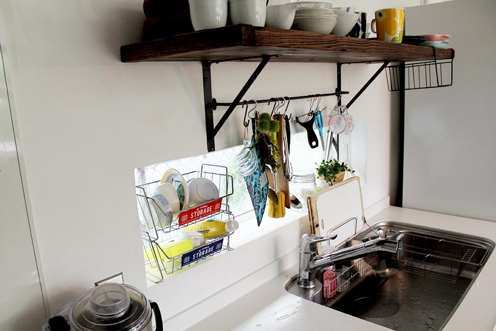 手元を明るくプライバシーも考慮した低めの窓。その上にこれまたDIYのビンテージシェルフ。