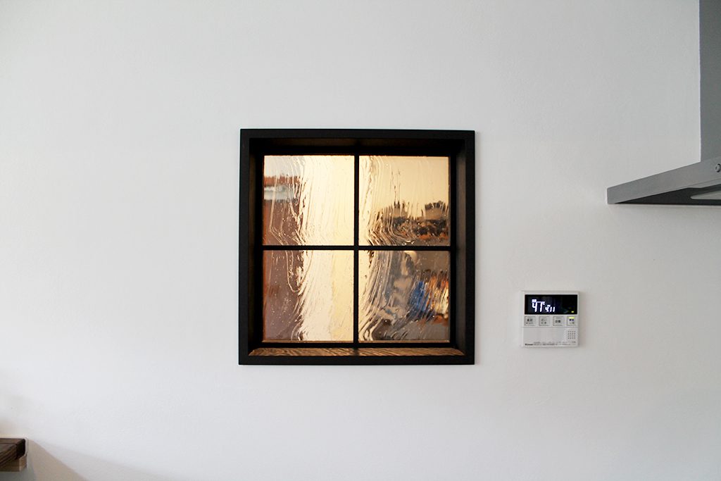 キッチンと玄関の壁の飾り窓は、アンティークガラスをあしらった施主支給の一品。おしゃれな上に家族が帰ってきたらすぐわかる。