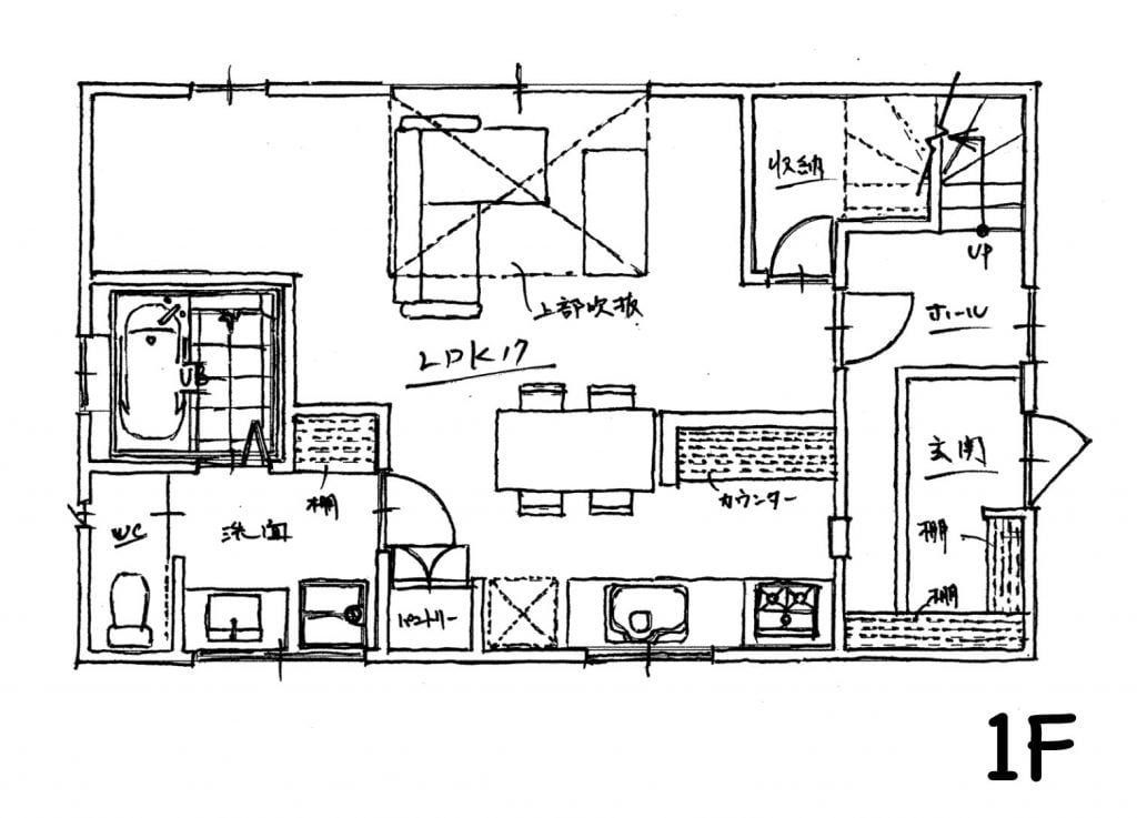 二階建て木造住宅。1Fには吹き抜けのLDKとカウンターキッチン。収納とキッズコーナーと水周り。
