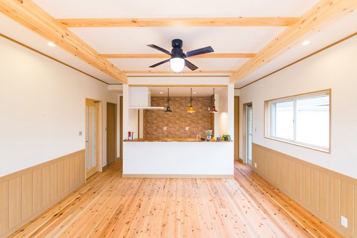 無垢フローリングとむき出しの梁のウッディ感をしとどに醸してやまない。