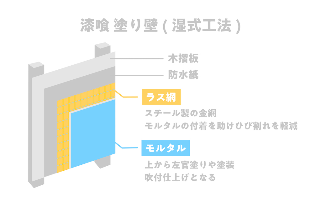 職人が現場でモルタルや仕上げ材を塗って仕上げる工法のこと